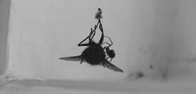 It was nauseating to listen to the high whine of the fly’s wings while I attempted to eat my breakfast. I almost intervened. The sickening extension of each thick silence that stretched between moments of terror. The thought of those whisper-thin arms brushing against a wing or an eye. The mental torment of each tiny bounce in the web as it pulled tighter on his legs. The eventual resignation of stillness.